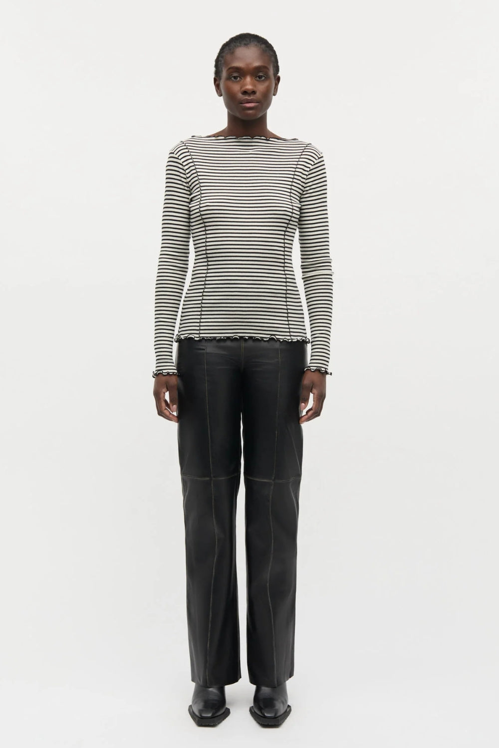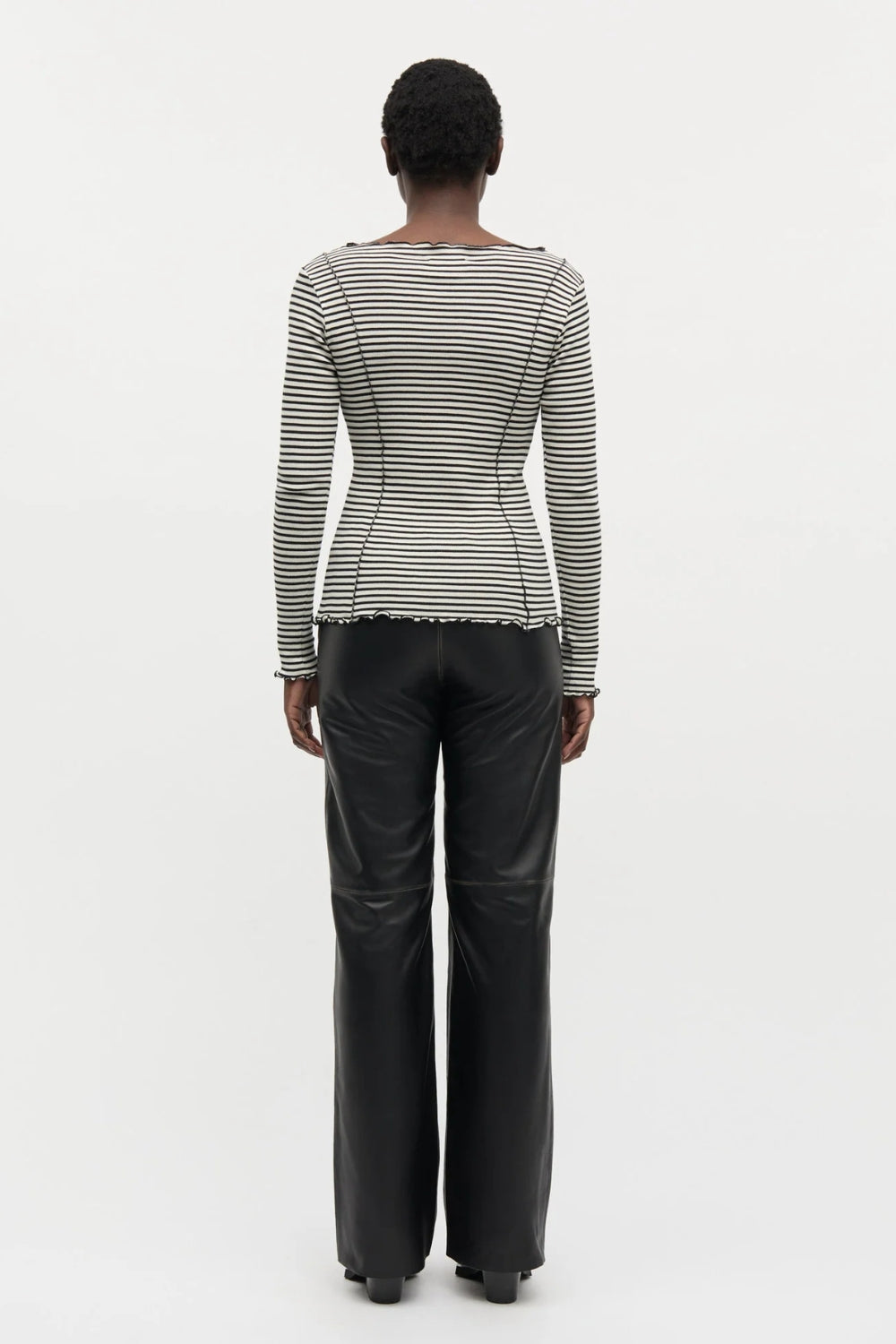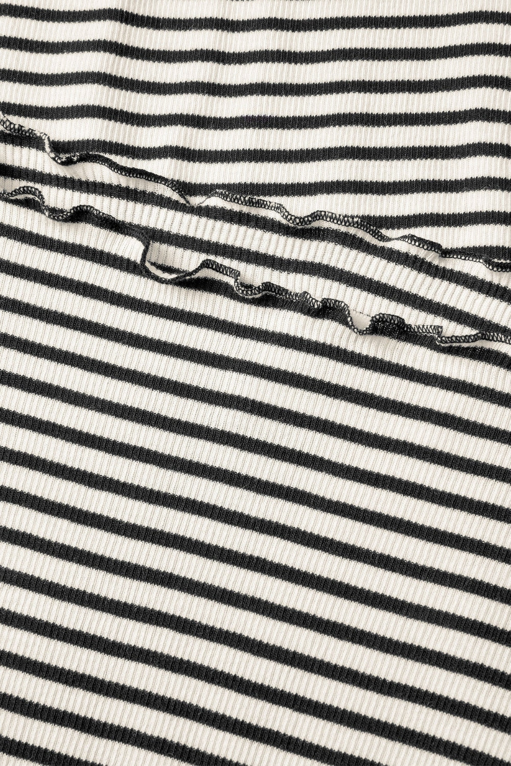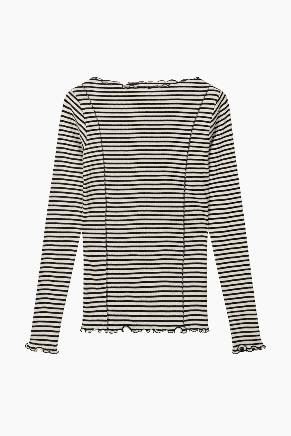 Den stribede langærmede top er en basic top med fine, bølgede afslutninger og dekorative overlock-sømme, der giver et feminint og moderne udtryk. Den tætsiddende pasform gør den perfekt både alene og som lag-på-lag under sæsonens jakker og strik.
