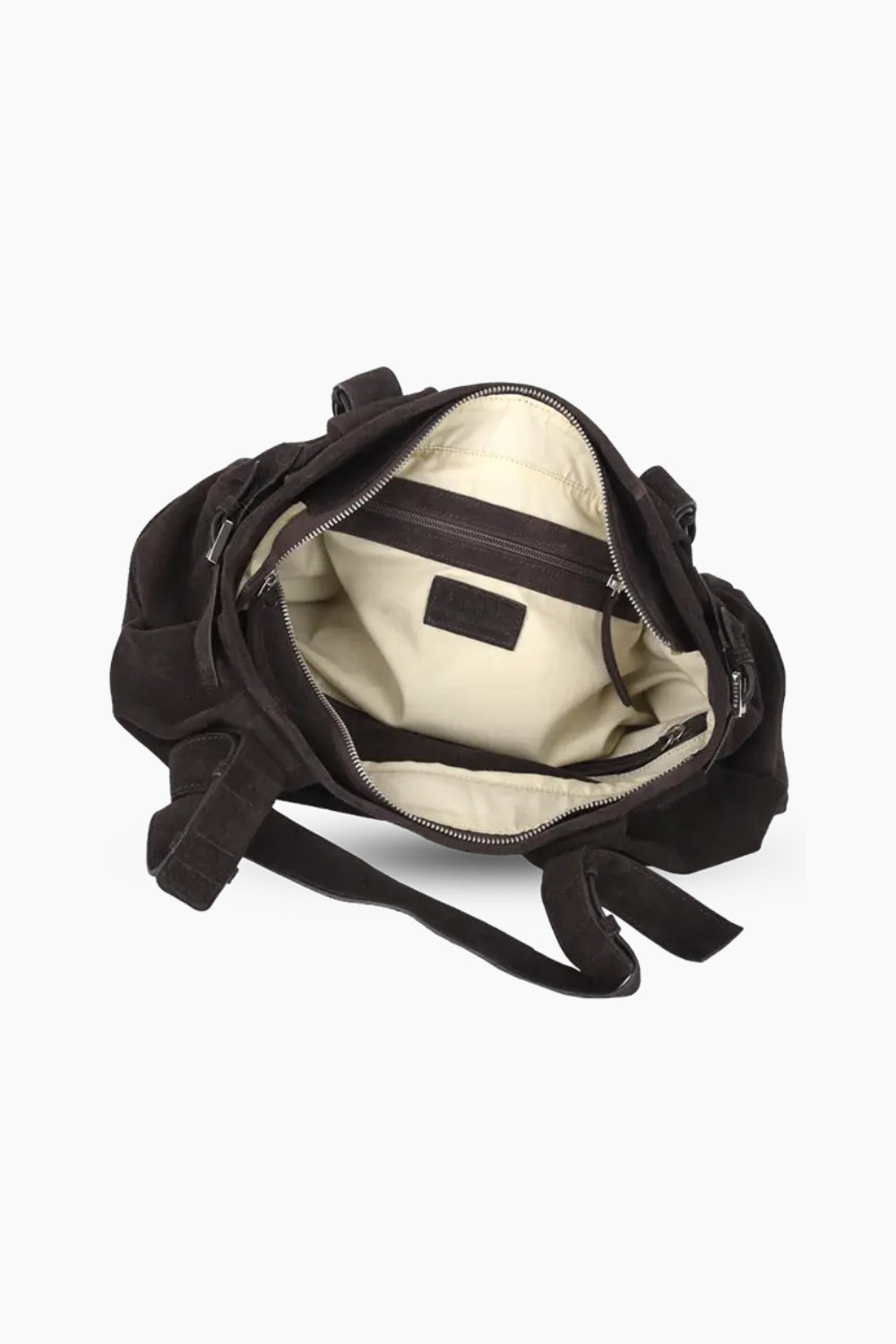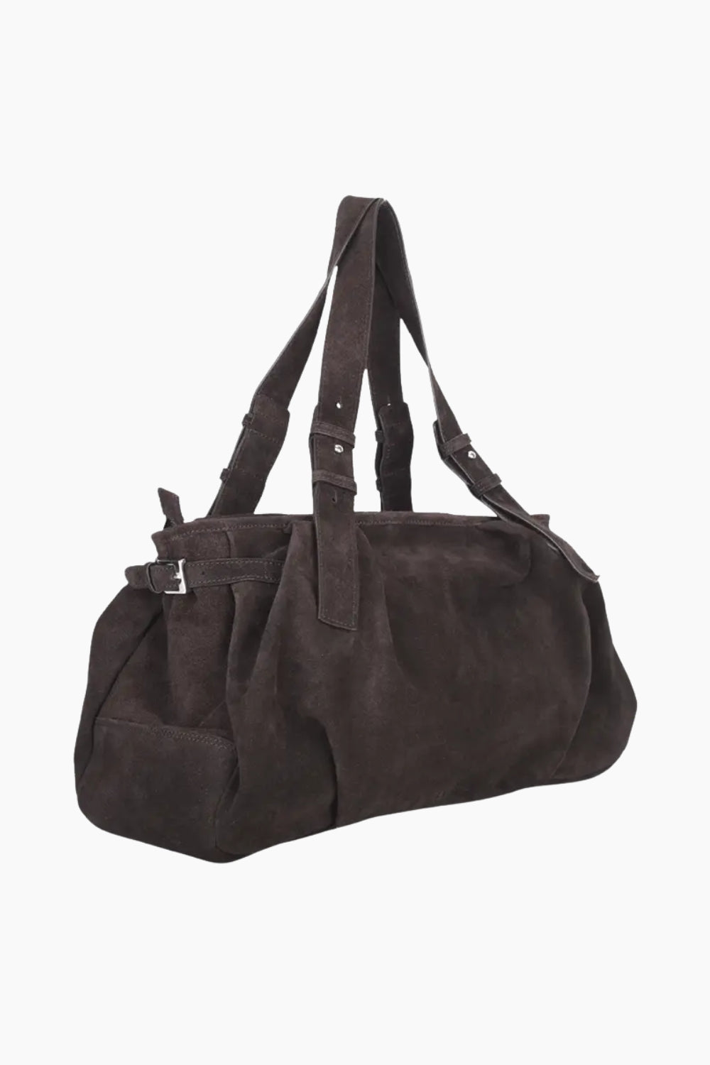 En tidløs og rummelig taske i blødt ruskind, der kombinerer funktionalitet med et eksklusivt udtryk. Tasken har et afslappet, men sofistikeret design, som gør den perfekt til både hverdagsbrug og weekend. Det naturlige ruskind giver tasken karakter og patina over tid, mens de brede hanke sikrer en behagelig pasform over skulderen.