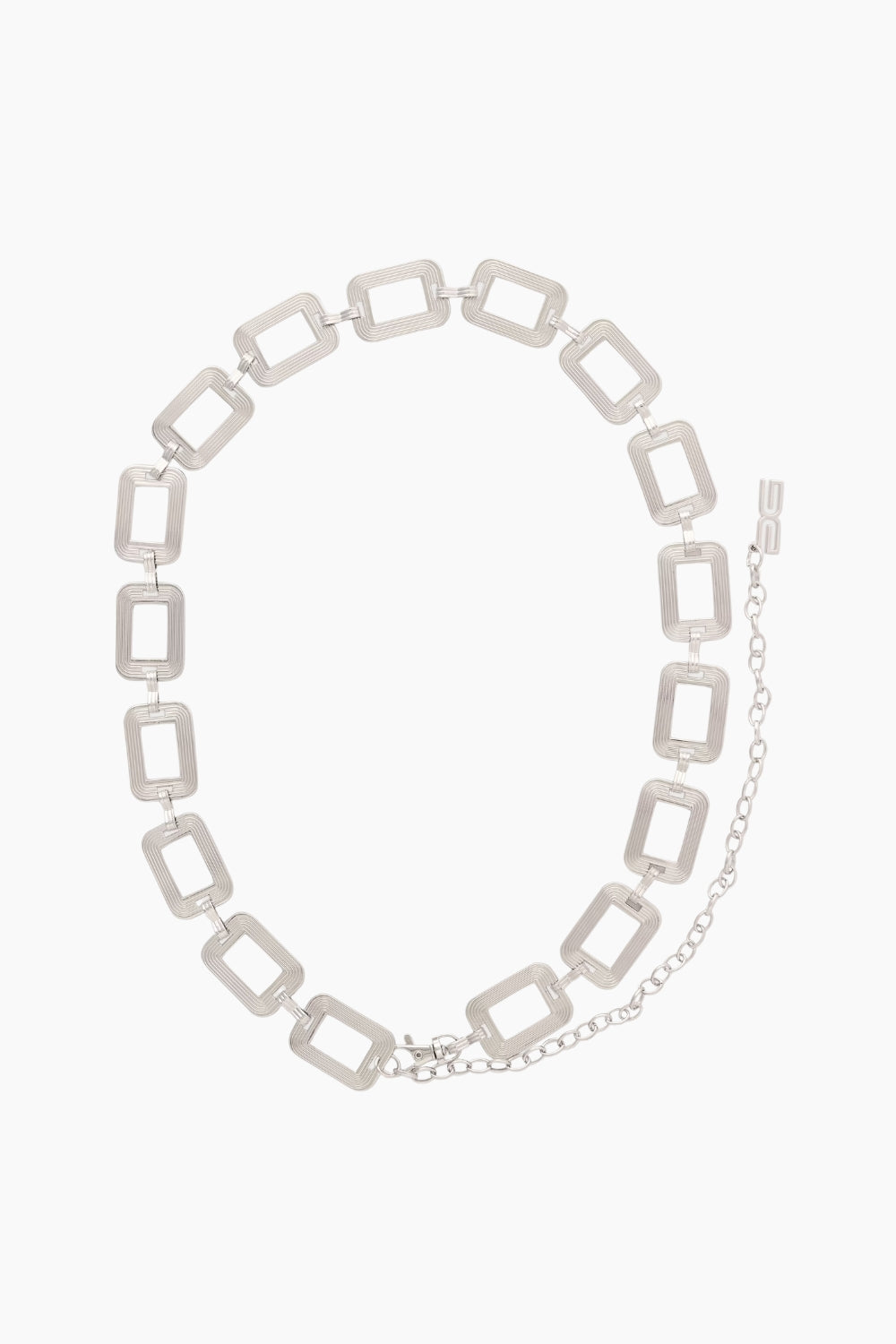 Dette elegante kædebælte i sølvlook tilfører et stilrent og moderne udtryk til ethvert outfit. Bæltet er designet med firkantede led, der giver et grafisk og eksklusivt look, mens den justerbare kædelukning sikrer en fleksibel pasform. Brug det i taljen over kjoler, blazere eller strik - eller lavt på hoften for et mere afslappet udtryk. Et alsidigt accessory, der løfter både hverdags- og festlooks.