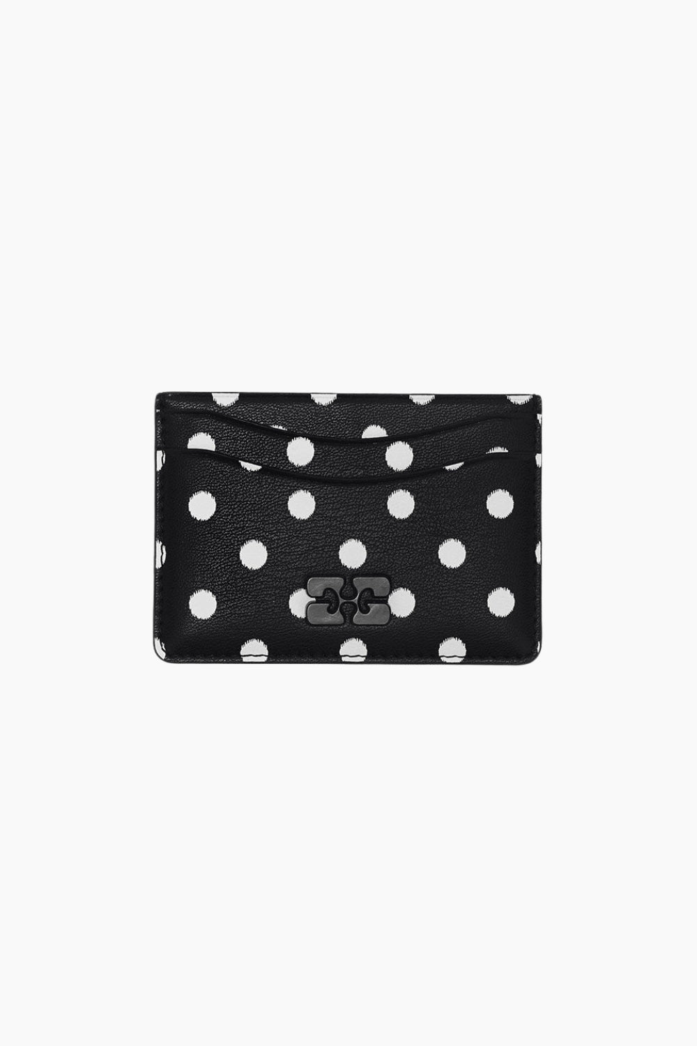 Bou Card Holder Printed er en stilren og kompakt kortholder i sort læder med klassiske hvide polkaprikker. Det ikoniske Bou-spænde på fronten giver et elegant GANNI-touch, mens det slanke design gør den ideel til både hverdag og fest. Perfekt til dig, der ønsker en lille pung, der nemt passer i tasken - eller lommen.