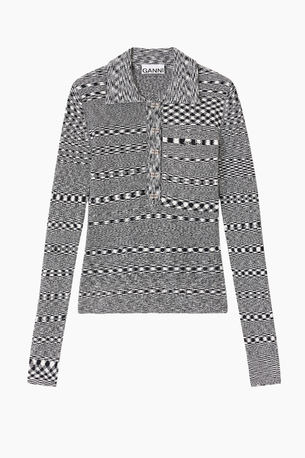 Opgrader din hverdagsstil med denne sort/hvide Spacedyed Polo fra GANNI strikpolo i et moderne jacquardmønster. Den slimfit pasform fremhæver silhuetten, mens de grafiske tern og striber tilfører et cool, retro-inspireret udtryk. Med klassisk polokrave og halv knaplukning er den både komfortabel og sofistikeret – perfekt til alt fra kontorlook til afslappede hverdage.