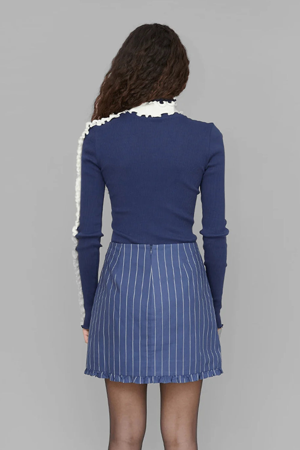 Amelie Seamless Top fra OperaSPORT er en elegant og iøjnefaldende bluse, der kombinerer komfort med et unikt, skulpturelt udtryk. Den er lavet i en blød, strækbar ribkvalitet, som former sig smukt efter kroppen uden at føles stram. Den høje flæsekrave og den kontrastfarvede, bølgede kant langs skulderen og ærmet giver et eksklusivt og kunstnerisk look, der gør toppen perfekt både til hverdagsbrug og mere dressed-up anledninger.