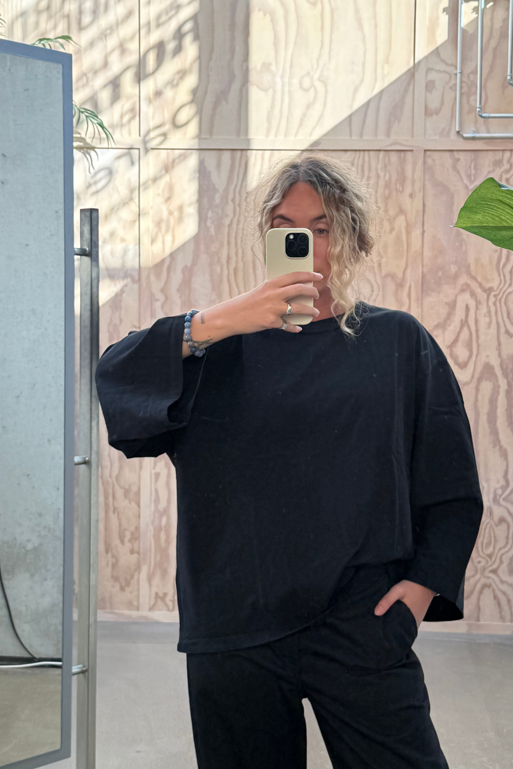 American Vintage byder på den perfekte basic med denne sorte T-shirt. Designet i en oversize pasform med brede ærmer og rund hals, giver den et afslappet og moderne udtryk, der let kan styles til både hverdag og mere casual outfits. T-shirten er fremstillet i blød bomuld, hvilket gør den behagelig at have på hele dagen. Brug den med jeans, shorts eller lag-på-lag under en blazer for et enkelt og stilrent look.