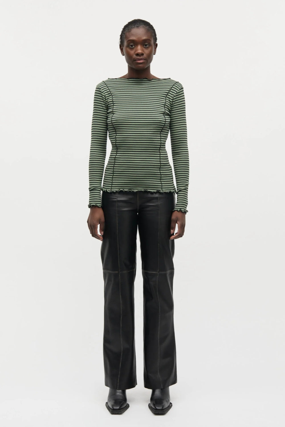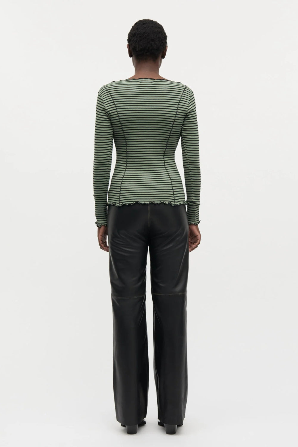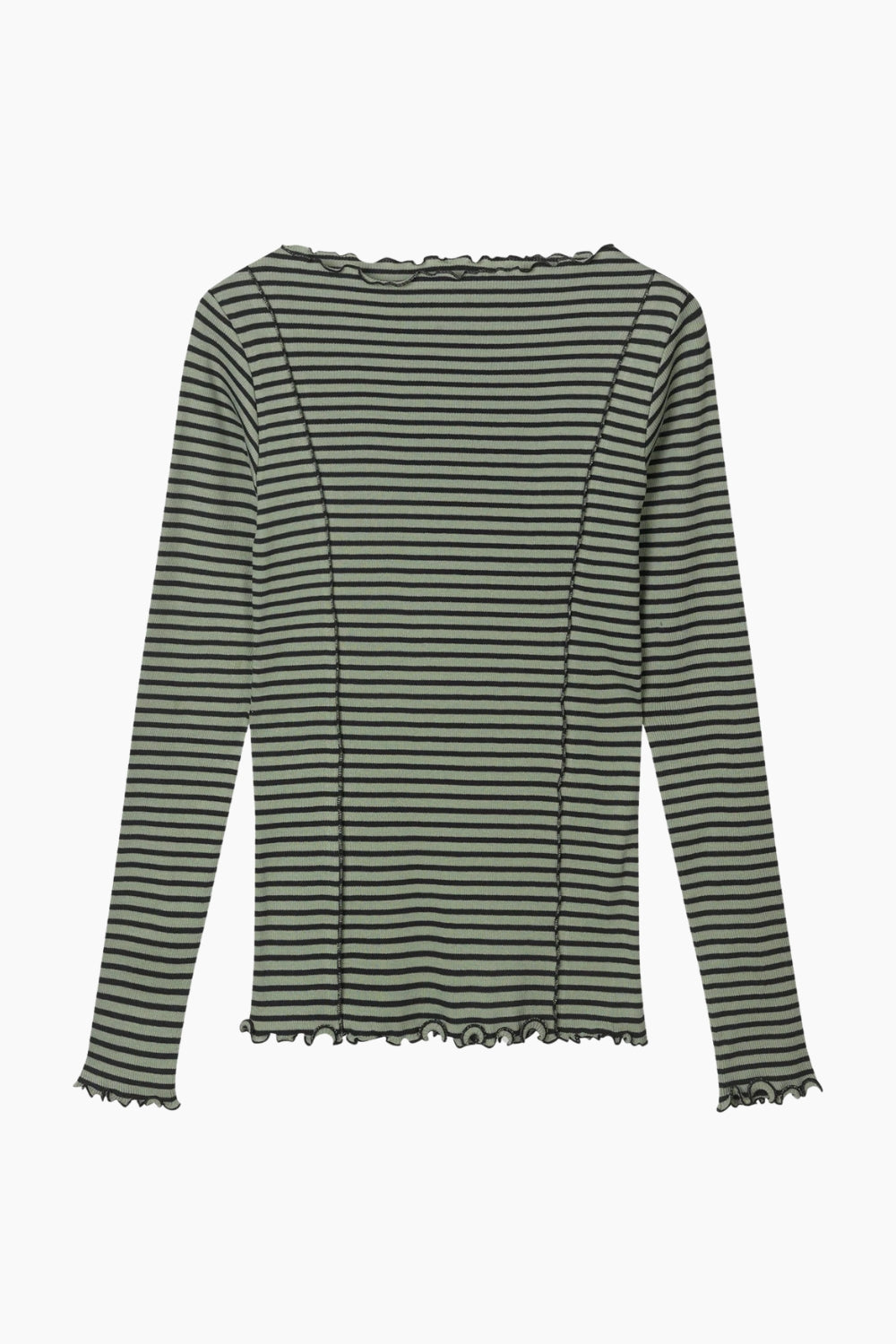 Den stribede langærmede top er en basic top med fine, bølgede afslutninger og dekorative overlock-sømme, der giver et feminint og moderne udtryk. Den tætsiddende pasform gør den perfekt både alene og som lag-på-lag under sæsonens jakker og strik.