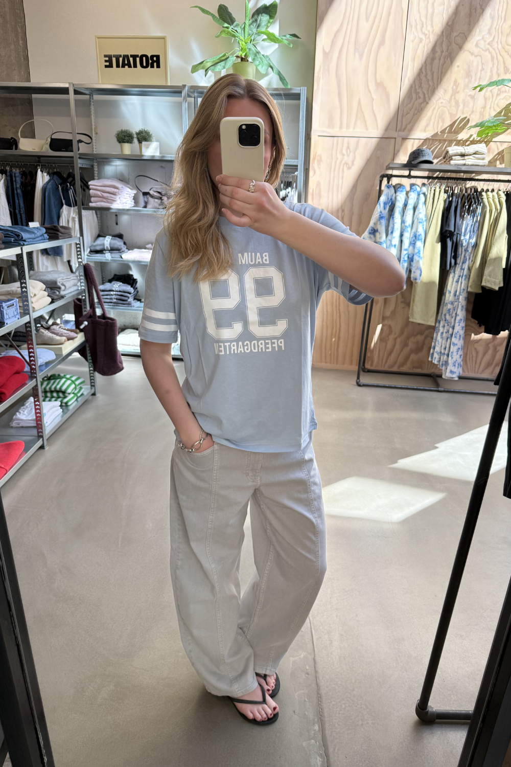 Baum und Pferdgarten Jawo T-shirt er en afslappet og moderne T-shirt i Kentucky Blue med et cool, grafisk udtryk. Den er fremstillet i 100% økologisk bomuld, som giver en blød og behagelig kvalitet til hverdagsbrug. Den afslappede pasform og runde hals skaber et klassisk look, mens print foran og på ærmerne tilfører et unikt og sporty touch. En alsidig T-shirt, der nemt kan styles med jeans, shorts eller nederdel for et afslappet outfit.