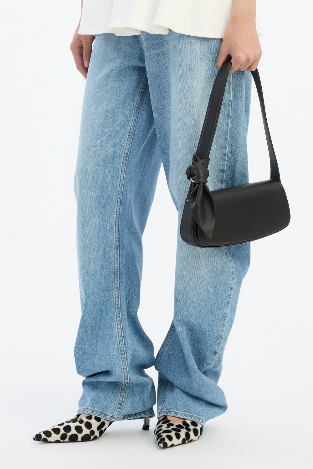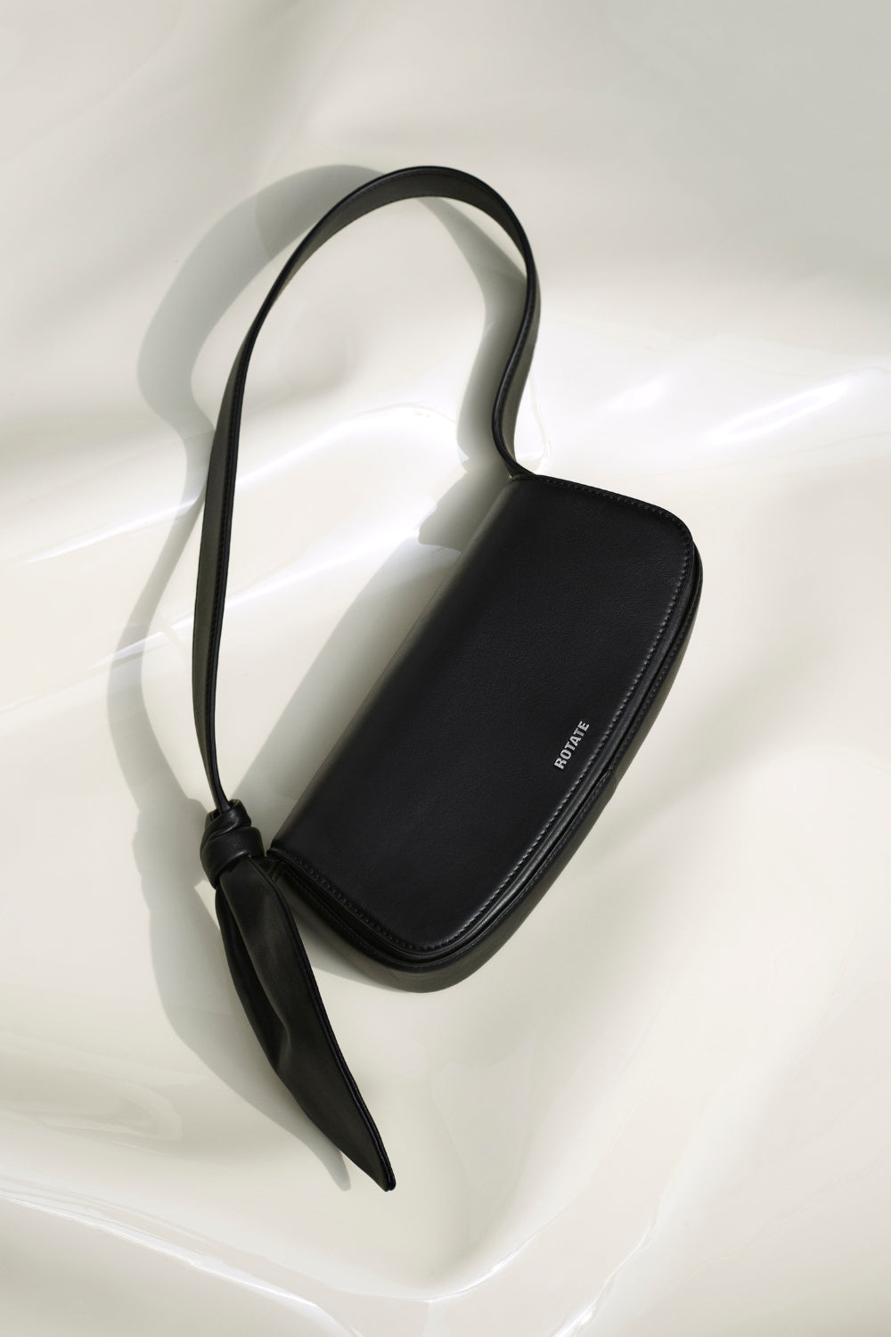 Denne elegante skuldertaske fra Rotate forener minimalistisk design med et markant, feminint twist. Tasken er udført i glat sort læder med en struktureret, rektangulær silhuet, der giver et moderne og sofistikeret udtryk. Den karakteristiske knudedetalje på skulderremmen tilfører et ikonisk Rotate-touch, mens den kompakte form gør tasken ideel til både dag og aften. Et stilrent accessory, der løfter ethvert outfit.