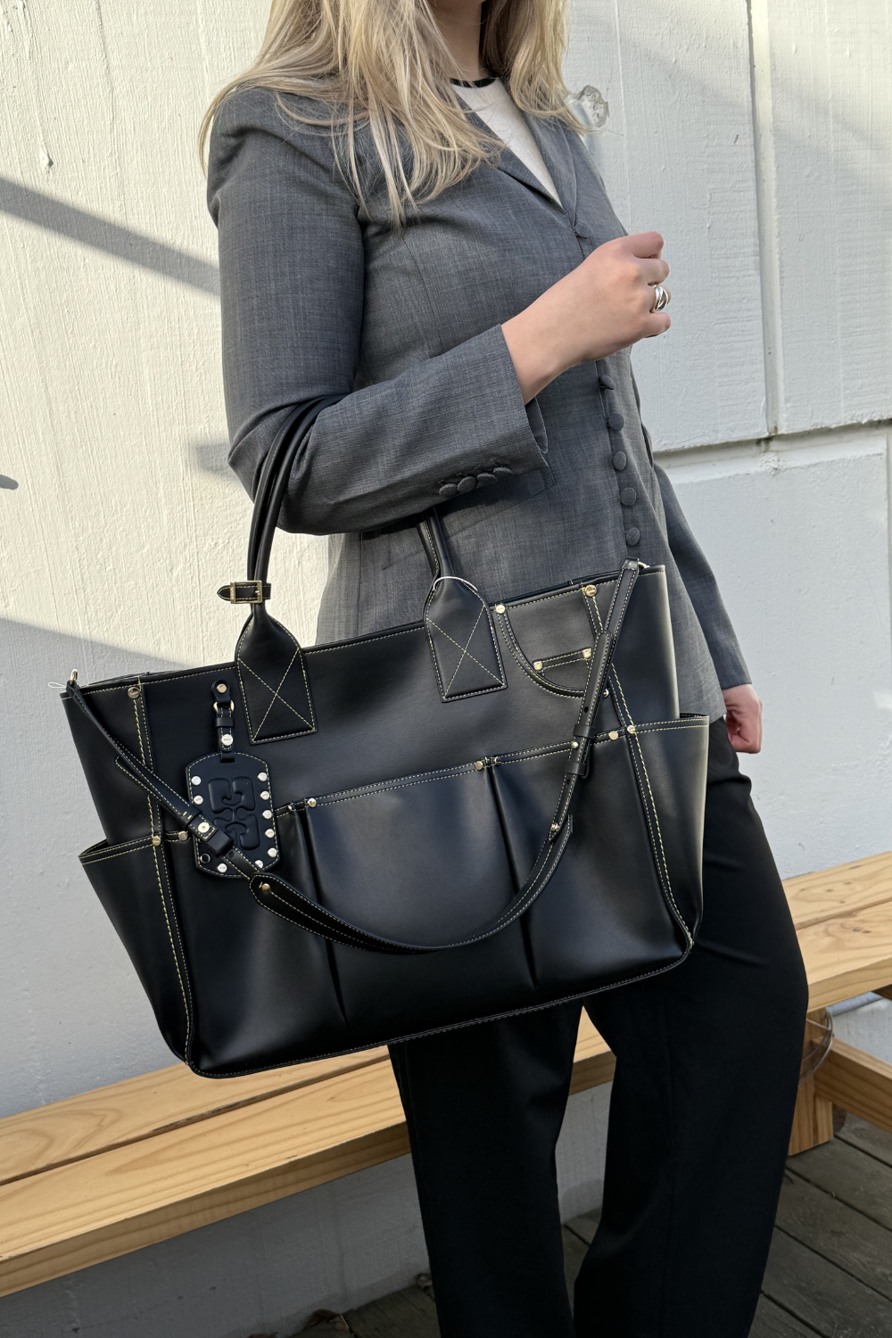 Posy tasken fra GANNI er en rummelig og stilfuld taske, der nemt kan bruges som weekendtaske. Den store størrelse gør den ideel til overnatninger, korte getaways eller travle hverdage, hvor du har brug for ekstra plads. Det minimalistiske sorte design giver et tidløst og eksklusivt udtryk, mens den karakteristiske Posy-silhuet tilfører et moderne twist. Perfekt til dig, der ønsker en funktionel taske uden at gå på kompromis med stil.