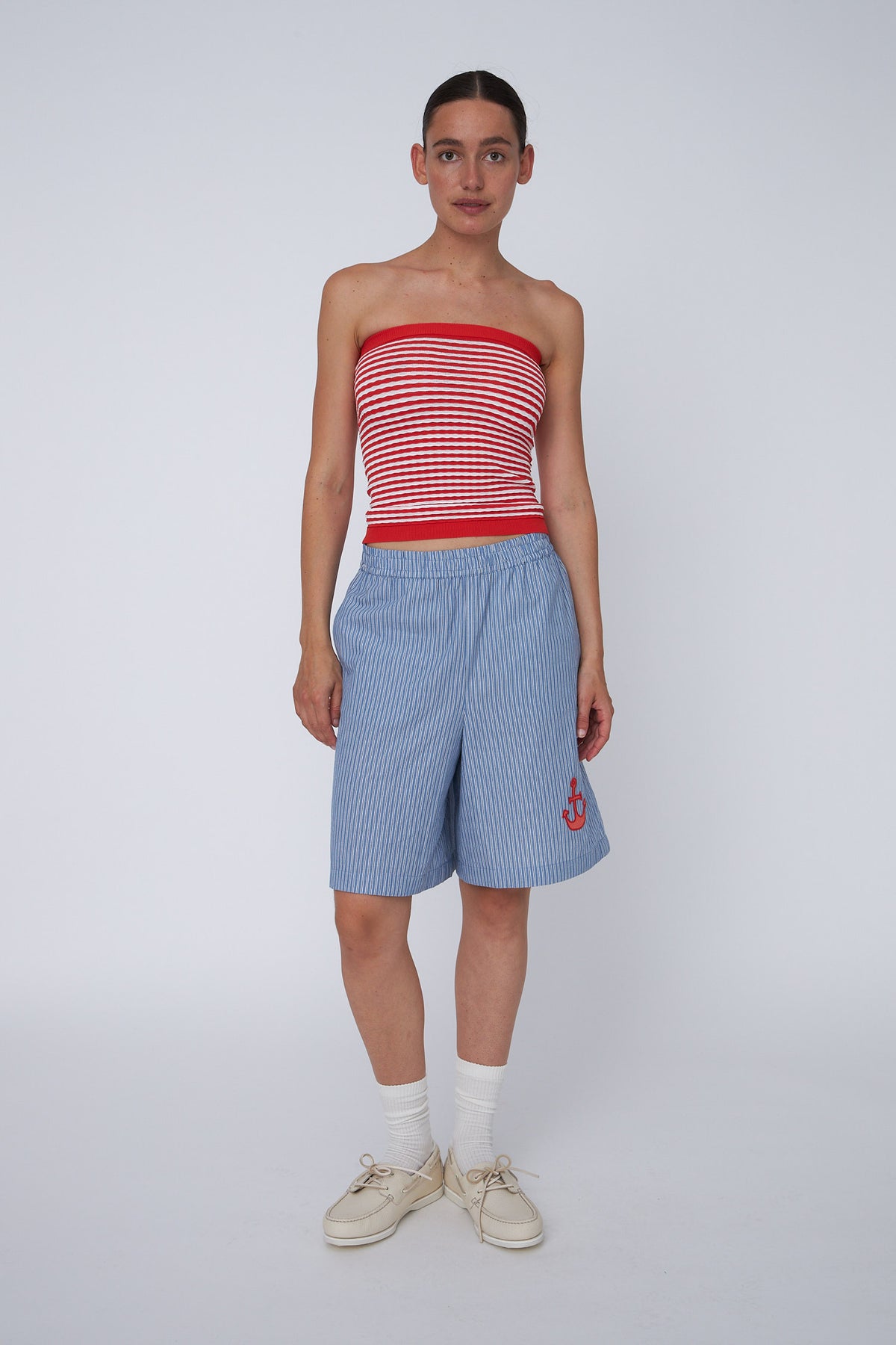 Striped Anchor Embroidered Shorts i Blue Stripes er knælange, afslappede shorts med et maritimt touch. De blå striber giver et klassisk look, mens det broderede anker på siden tilføjer en fin og legende detalje. Shortsene har elastisk talje og praktiske lommer, hvilket gør dem både komfortable og funktionelle. Perfekte til varme sommerdage, ferie eller til at styles med en matchende skjorte eller t-shirt for et casual sæt.