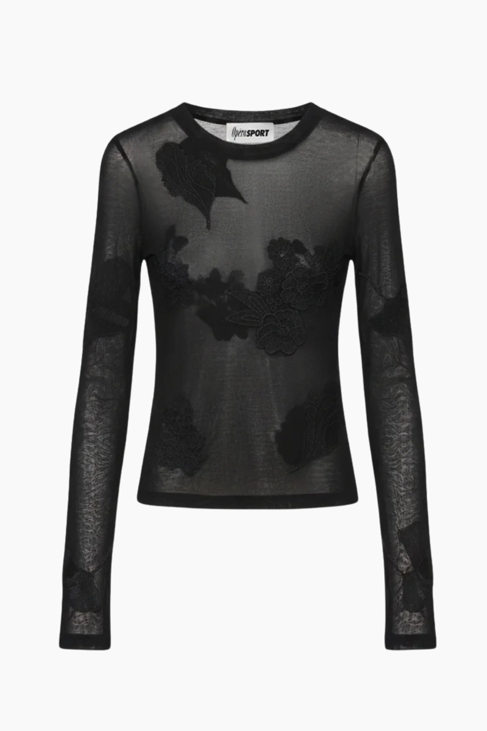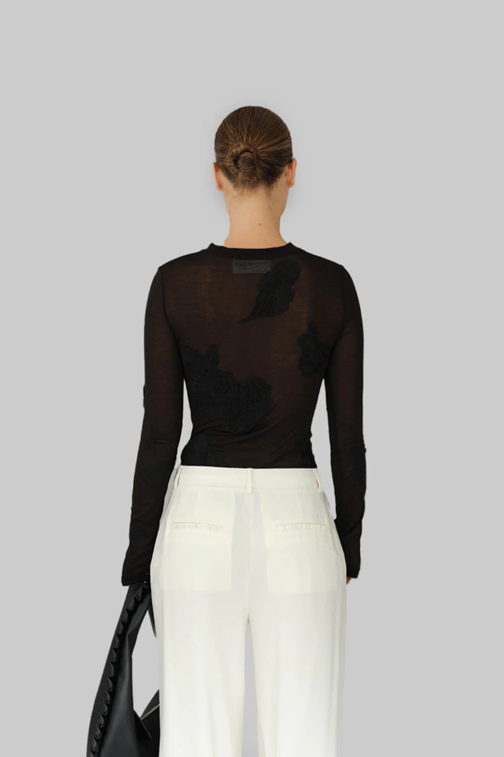 Ziva Top er fremstillet i 100% modal i klassisk sort, hvilket giver en let og semi-transparent finish med et elegant fald. Den bløde kvalitet smyger sig let om kroppen og skaber et feminint og sofistikeret udtryk. Toppen har lange ærmer og rund halsudskæring, mens tonale blomsterapplikationer i blonder er placeret over kroppen og ærmerne. De fine detaljer tilfører tekstur og et delikat, kunstnerisk præg, som giver designet dybde uden at bryde det minimalistiske udtryk.